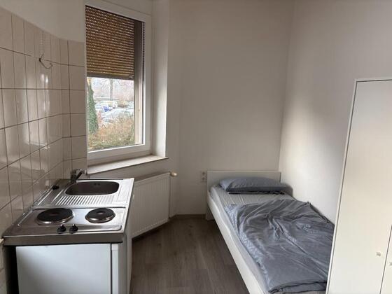 Möblierte 1 Zimmer Wohnung mit mit Küchenzeile mit Herd und Kühlschrank. Waschmaschine, Trockner und WLAN stehen ebenfalls kostenlos zur Verfügung.
